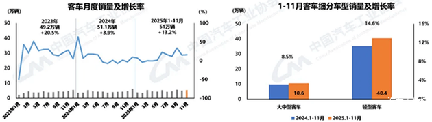 1-11月,客车产销分别完成50.8万辆和51万辆,同比分别增长12.8%和13.2%。其中,大中型客车销量10.6万辆,同比增长8.5%;轻型客车销量40.4万辆,同比增长14.6%。