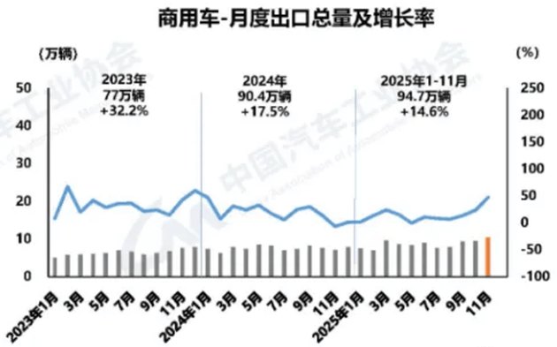 1-11月,商用车国内销量292.4万辆,同比增长9.1%。其中,货车国内销量254.7万辆,同比增长8.6%;客车国内销量37.6万辆,同比增长12.7%。商用车出口94.7万辆,同比增长14.6%。其中,货车出口81.3万辆,同比增长14.6%;客车出口13.4万辆,同比增长14.8%。