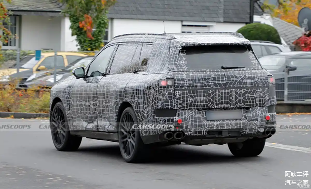侧面保留经典门窗线条,大尺寸轮圈依旧是硬派标配,同时首次引入隐藏式门把手,兼顾科技感与低风阻。目前谍照中尾灯仍为临时伪装,但据推测可能采用类似iX3的全新家族式尾灯样式;双边共两出排气布局则彰显燃油版身份,运动感拉满。