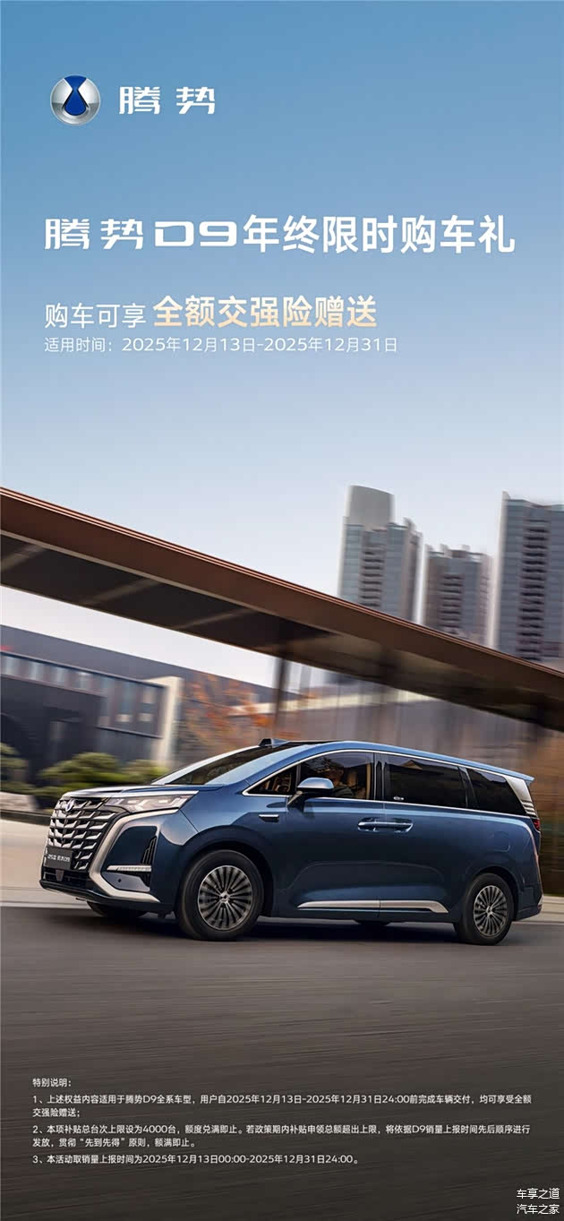 从打破合资垄断,到成为全球首个达成30万辆交付的新能源MPV,腾势D9所取得的每一项成绩,都源自用户的真实选择与长期信赖。此次面向购车用户全额赠送交强险的年终政策,不仅是一项购车权益,更是腾势汽车对用户价值的持续回应。年终购车政策已全面开启,腾势D9正等待更多用户与冠军同行,向美好生活腾势而上!