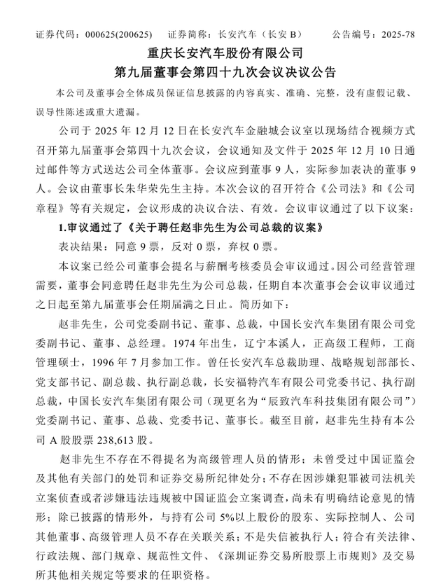近日,长安汽车发布第九届董事会第四十九次会议决议公告,审议通过了《关于聘任赵非先生为公司总裁的议案》。此次任命标志着空缺长达8个月的公司总裁职位终于落定,为公司全力冲刺2025年300万辆销量目标注入新的管理动能。