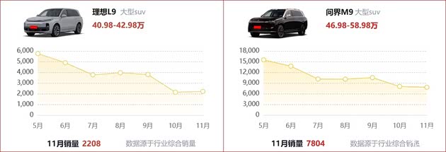 不知道您有没有发现,国内车市不少“当时现象级的9系车型”,或随着自家推出低端产品之后,或受市场竞争、消费者喜好转变和审美疲劳影响,销量正呈逐渐下滑趋势,比如 理想L9,比如问界M9,我们先来看看这两款车型近半年左右的销量曲线。