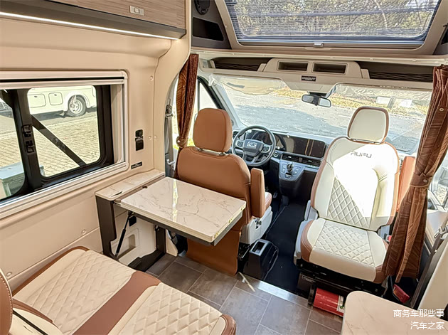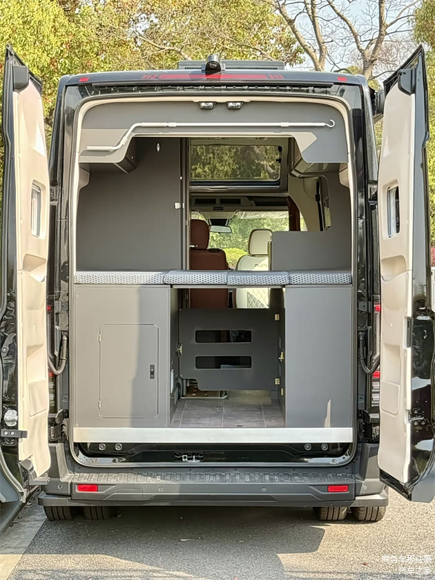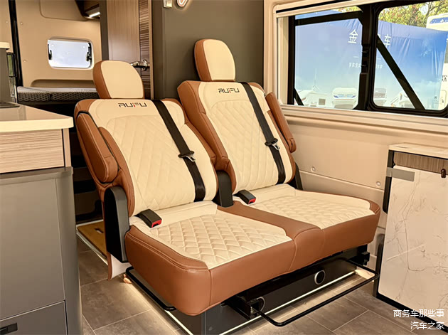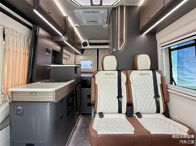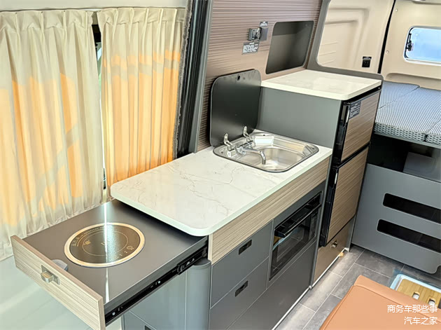 车内各个区域的布局很明显,会客厅的区域,联排座椅搭配上可移动拆卸的桌板,副驾驶的座椅可以往后旋转,厨房的区域,加长版的台面,而且还有隐藏式的电磁炉延伸板,微波炉,方盖板的洗水槽通通都配好了,还有冰箱。卫生间的区域用的是拓展的卫生间门,需要使用的时候展开,不需要的时候回缩,非常大限度的利用了整个车里面的空间。休息区,有一张大床,长度5米9,宽度在1米2,睡两个人还是没什么问题的。而且车内还有可开启的天窗,增加了整个车子的通透性。