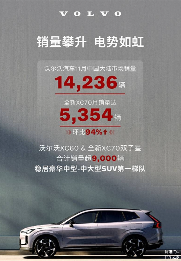 如果说2025年豪华车市场谁比较受欢迎,喵哥觉得沃尔沃全新XC70可以有一个席位,这款9月26日才正式上市的车型,10月还在积累口碑,11月销量就达到5354辆,环比增长94%,上市第二个完整月就成为了沃尔沃品牌销冠,截至11月底累计销量已达到9211辆,距离月销万辆的成绩不远了。