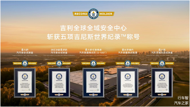 12月12日,吉利全球全域安全中心于杭州湾正式发布,并一举创下“全球最大的汽车安全试验室”、“全球最长的室内汽车碰撞测试跑道”、“全球最大的汽车环境风洞试验室”、“全球最大的任意角度汽车碰撞测试区(0-180°)”、“全球测试功能最多的汽车安全试验室”五大吉尼斯世界纪录。