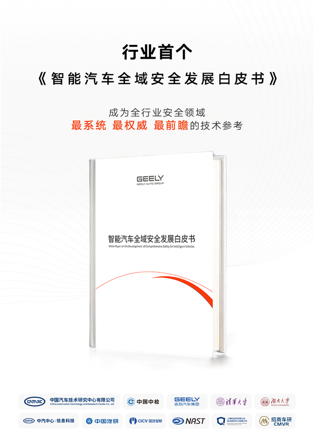 基于全球智能化浪潮推动汽车体验升级与安全技术全面拓展的趋势,吉利联合中汽中心、中国检验认证集团、清华大学等11家产学研机构共同发布了《智能汽车全域安全发展白皮书》,立足产业发展全局,明确以“人”为核心的全域安全目标,为行业安全发展提供了兼具战略性与实操性的行动纲领。