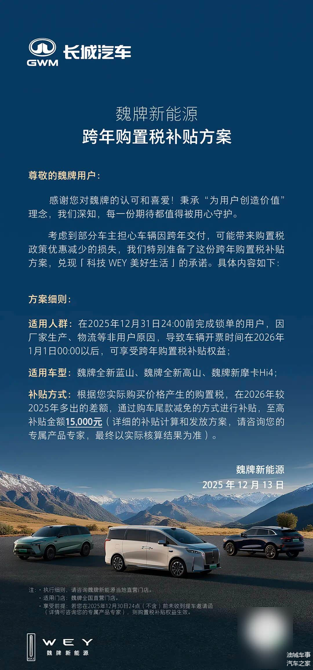 随着年底临近,不少消费者在购车时会关注车辆开具发票的时间,因为这直接关系到车辆购置税的具体缴纳金额,近期,魏牌新能源针对这一实际情况,公布了一项购置税相关的补贴方案,主要面向因交付时间可能跨越年度而涉及税负变化的用户。