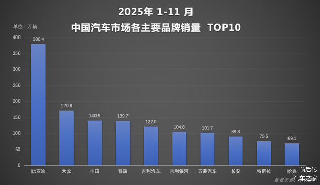 从累计数据看,2025年前11个月比亚迪累计销量418.2万辆,同比增长11.3%,年度销量目标完成率超九成。随着12月市场进入冲刺阶段,比亚迪有望超额完成全年目标。
