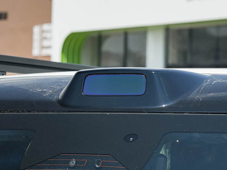 车身侧面,无边框后视镜视野开阔,两段式腰线和隆起的翼子板呈现很强的肌肉感,城垛式轮拱与轮胎之间空隙较大,悬架行程长,通过性好,A柱50°的倾角设计,优化风阻的同时提升前方视野。平直车顶为后排提供充裕的头部空间。