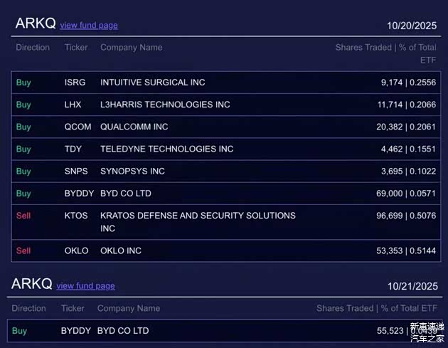 除国际投行外,以凯茜·伍德(女版巴菲特)旗下方舟投资为代表的长线资金,也在加速布局比亚迪。方舟投资在10月20日通过旗下ARKQ基金买入69000股比亚迪,10月21日再度增持55523股,这一连串的动作,充分表明了该资本对比亚迪前景的看好。