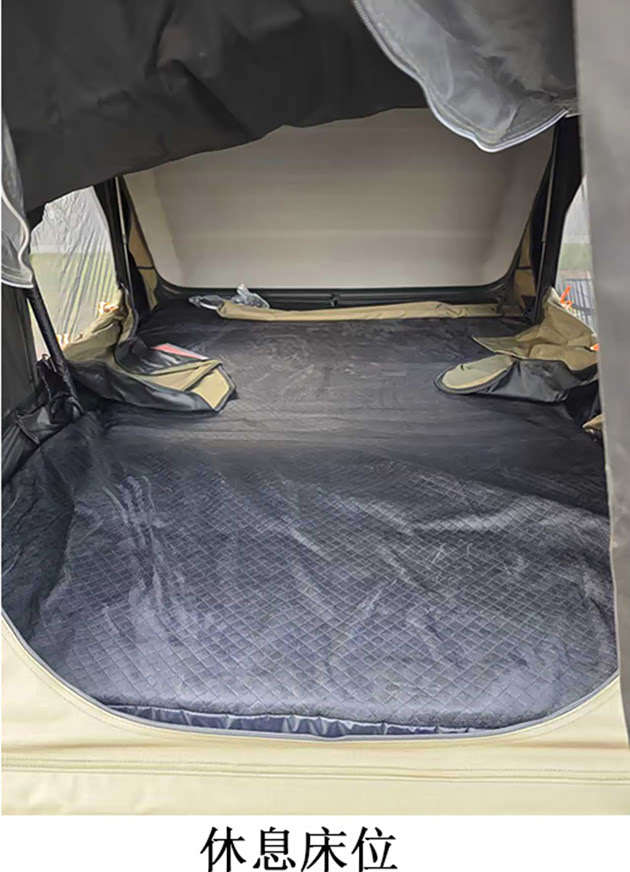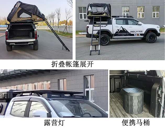 车顶前部带有行李架平台,还提供了露营灯。和常见皮卡版宿营车纵向布局的车顶帐篷不同,这辆威麟R08宿营车式放置在车顶后部尾箱盖上,为侧向展开式,展开后形成车顶的车床效果。另外新车还提供了便携式马桶。
