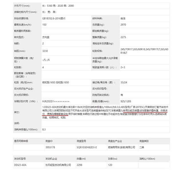动力配置部分,新车搭载的是来自东风轻型发动机公司的2.3T柴油发动机,最大功率为120千瓦。