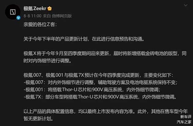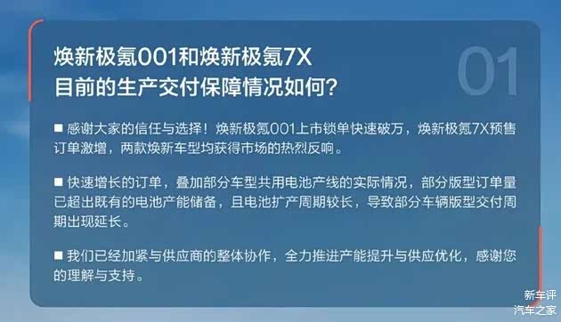 根据极氪的补充说明,由于焕新极氪001和焕新极氪7X的订单快速增长,加之部分车型共用电池生产线,超出既有的电池产能储备,预计交付时间会延长,再加上电池产能扩产周期比较长,导致部分车型的交车周期不得不延长。而且极氪还建议刚需用车的用户可以优先考虑极氪7X的75kWh神盾金砖电池版本……