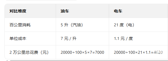 这时候,你再来计算里程数,我们按照一辆油车,百公里油耗是6个油,每个油是7块钱,而同样一辆大小的电车,百公里电耗是21度电,一度电1.1块钱,他们行驶2万公里需要花费多少钱?我给大家整理成了表格,对比一下会发现,油车和电车的用车成本一计算,电车只是比油车少花了2380元,也就是说,剔除掉保险后,优势并不明显。