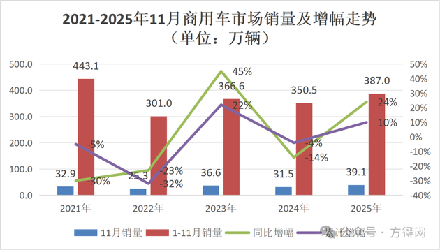 11月商用车市场交出亮眼成绩单——实现同环比“双增”,同时销量更是创下近五年同期新高。