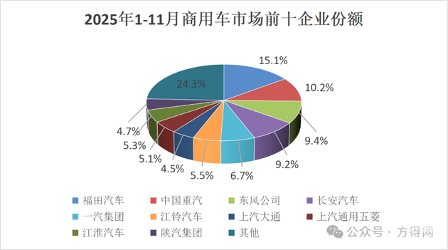 从市场份额来看,销量前十企业11月合计份额高达75.6%。排名前五的企业合计份额高达49.2%。值得一提的是,10月行业前三强同样为福田汽车、中国重汽、东风公司,头部阵营整体格局保持稳定。