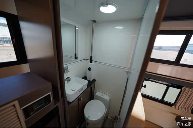 卫生间采用了后置独立卫浴间设计,配备了卫浴间侧换气扇、卫浴间照明灯、储物置物架、折叠一体式面盆、220V防水电源接口、淋浴花洒(冷热水)、梳妆镜和盒式马桶等设施,满足了用户在房车内的洗漱和卫生需求。在水电配置方面,车外配备了220V市电充电专用电源线(10m)和车外220V市电充电专用插座,方便车辆在有电源的情况下进行充电。车内拥有220V电源插座、豪华USB插座,还配备了充逆变智能交换机(3300W)、主副电池隔离器、液晶用电、水集成控制面板等。供水系统方面,配备了重力注水口、清水箱(175L)、灰水箱(40L)、暖风系统、热水系统、智能水泵和冷、热水供应管路,为车内提供了充足的水电供应。