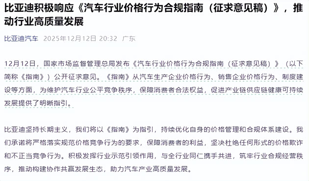 比亚迪则从行业示范的角度做出回应,称将以《指南》为指引持续优化价格管理和合规体系,坚决杜绝价格欺诈和不正当竞争。作为新能源汽车领域的龙头企业,比亚迪表示将与行业同仁携手筑牢合规经营秩序,推动构建协作共赢的发展生态,把更多精力投入到技术创新和产品升级上。