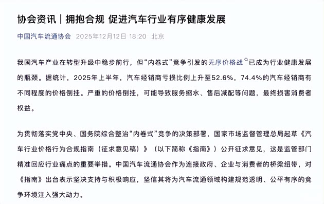 12月12日,国家市场监督管理总局向社会公开发布《汽车行业价格行为合规指南(征求意见稿)》,为持续升温的车市价格战划定明确“红线”。此时距离2026年不足半月,国内车市正上演年末“冲量大战”,“血本甩卖”“降价狂欢”的背后,是行业利润率跌至历史次低位的隐忧,而这份涵盖五章28条的《指南》,正试图为混乱的竞争按下“暂停键”,给消费者和车企都吃一颗“定心丸”。