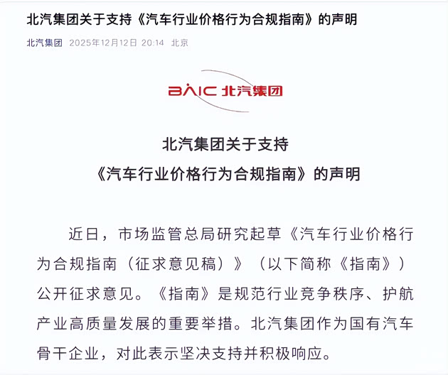 北汽集团作为国有汽车骨干企业,率先做出明确承诺,将把《指南》要求嵌入产品定价、经销商管理、促销推广的全流程。其相关负责人表示,将完善价格合规管理体系,严守公平竞争原则,杜绝低于成本价倾销和虚假宣传,同时发挥产业链“链长”作用,带动上下游伙伴共同落实合规要求,构建互利共赢的产业命运共同体。