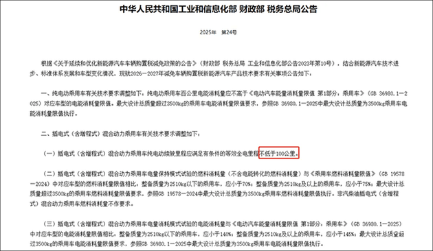 在工业和信息化部、财政部、税务总局三部门的联合公告中显示,2026-2027年减免车辆购置税的新能源汽车有产品技术要求,其中明确插电式(含增程式)混合动力乘用车纯电动续航里程应满足有条件的等效全电里程不低于100公里。