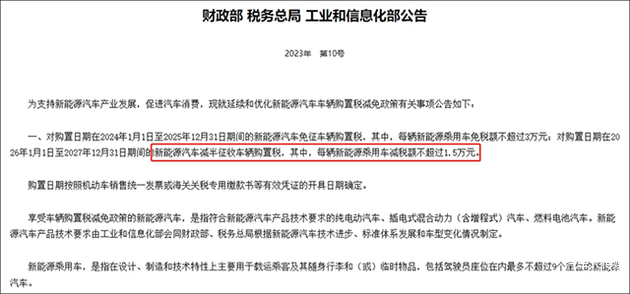 国家财政部、税务总局、工业和信息化部联合发布的《关于延续和优化新能源汽车车辆购置税减免政策的公告》显示:
