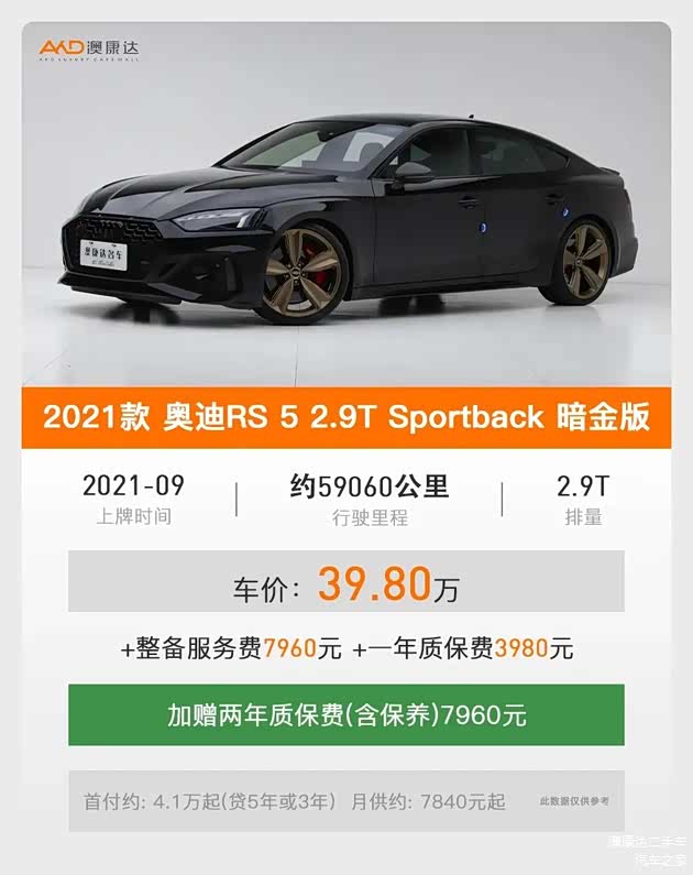 作为奥迪家族中兼具优雅与暴力的高性能轿跑, 奥迪RS 5 Sportback以风骚的四门溜背造型和强大的性能表现,深受车迷的喜爱,当然更重要还少不了价格,而澳康达二手车在售的这辆2021款 奥迪RS 5 2.9T Sportback 暗金版,2021年上牌行驶约5.9万公里,目前的二手车价不到40万哦!