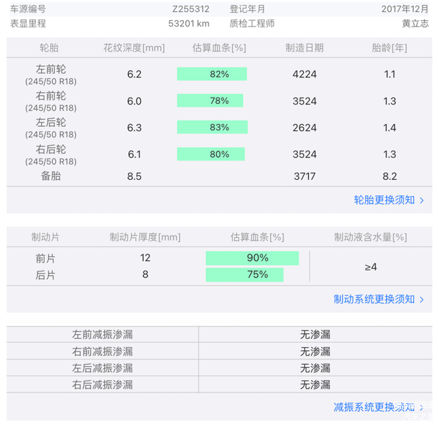 四条减振都没有渗漏的情况。四条轮胎的年龄还很新,余量也充裕,足够下任车主再用几个保养周期。