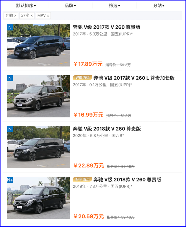 V260和V260L的新车都是60多万落地的价格,现在车龄5~8年的二手车,价格从10几万到20几万不等。