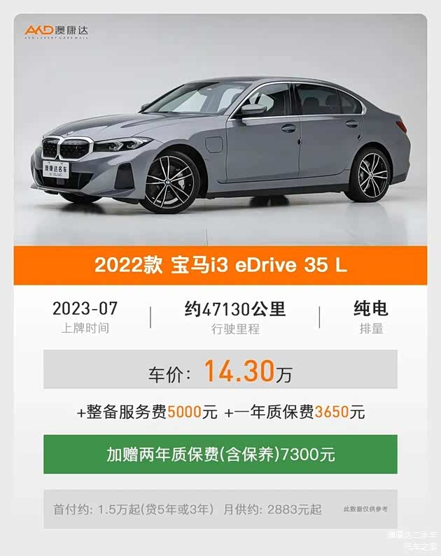 如果你想拥抱蓝天白云,那么,澳康达二手车在售的这台2022款 宝马i3 eDrive 35 L值得你重点考虑。2023年上牌的,行驶约4.7万公里,不用担心车况,我们不仅有全面的整备,更有赠送的2年质保与保养服务,用车更安心,如今它的二手车价不过14万出头而已,让你用普通合资B级车的预算,直接体验“人生绕不开一台3系”的美妙。