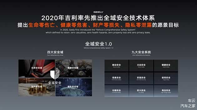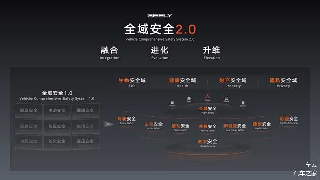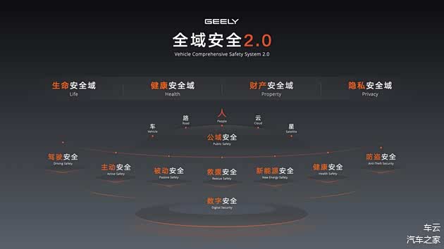 其次,我们来分析一下吉利『全域安全2.0』技术体系的核心逻辑。官方表示,2.0体系是从『整车安全』视角升级为『人-车-路-云-星』的生态视角,在延续生命安全、健康安全、财产安全、隐私安全四大安全域的基础上,通过九大安全系统的迭代升级,构建全场景、全周期的安全防护网络。