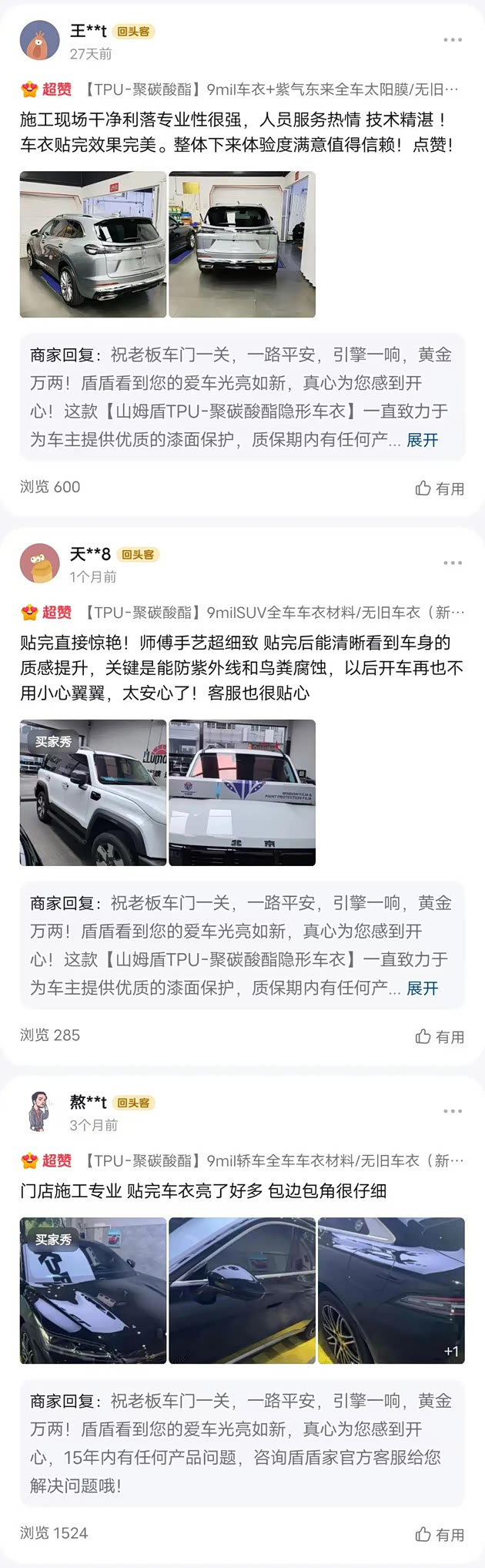 一位宾利车主在使用一段时间后发现车衣出现开裂情况,联系售后后很快便得到了免费更换的新膜。车主对山姆盾的售后保障十分满意,他说:“有了这超长质保和免费更换服务,我用车衣完全没有后顾之忧,山姆盾真是太靠谱了。”