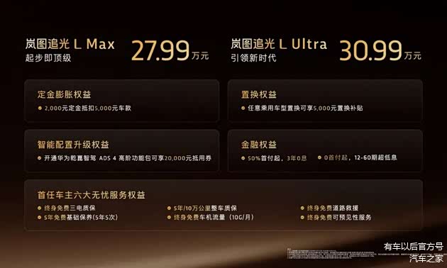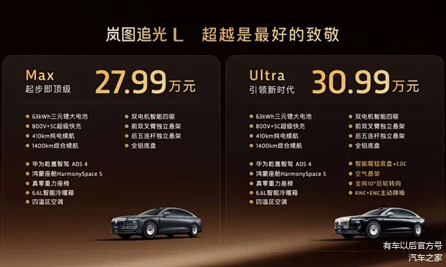 “破晓”主题的岚图追光L上市,这款被寄予厚望的豪华旗舰轿车终于揭晓价格:推出Max版和Ultra版两个配置,售价分别为27.99万元和30.99万元。