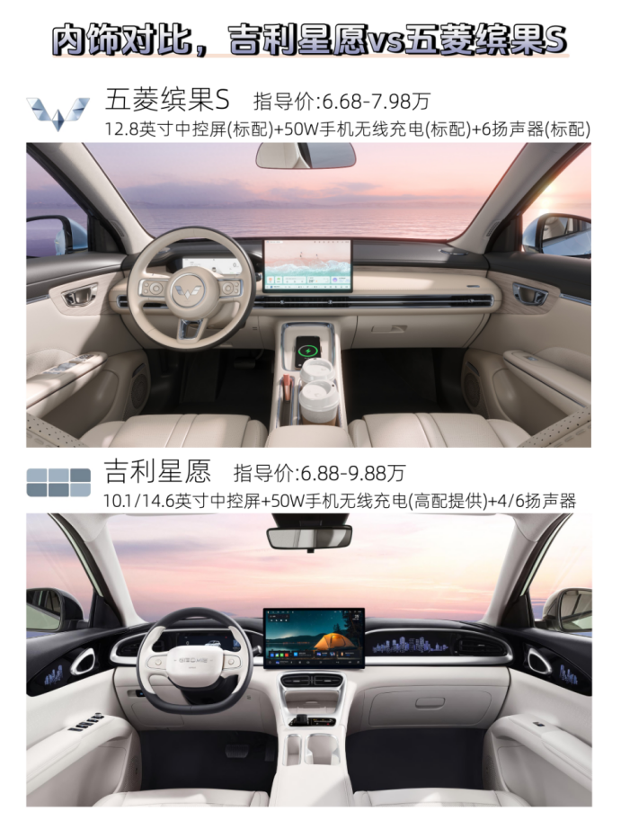 我们先来看配置,缤果S不仅将50W无线充、6扬声器、4气囊、无感进入等高价值配置做到了全系标配,而且还有8.88英寸全液晶仪表屏和12.8英寸悬浮式2K高清中控屏的双屏组合,以及融合Deepseek的全新灵语AI中枢体,不仅做到了入门即高配,更是满配全家桶。星愿虽然有4个扬声器、倒车影像等常用功能,但并不是全系标配,性价比比较常规。