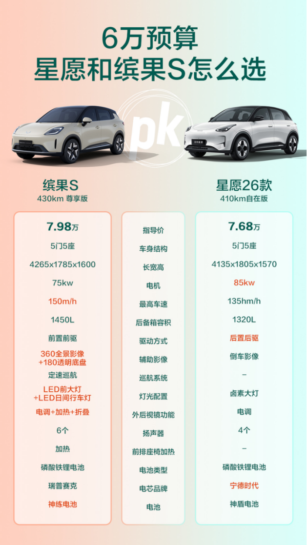 年轻人购车,6-8万是一个主力预算区间,在这个区间内的缤果S和星愿则是当下的热门之选,作为年轻人的你,会选择缤果S还是星愿呢?