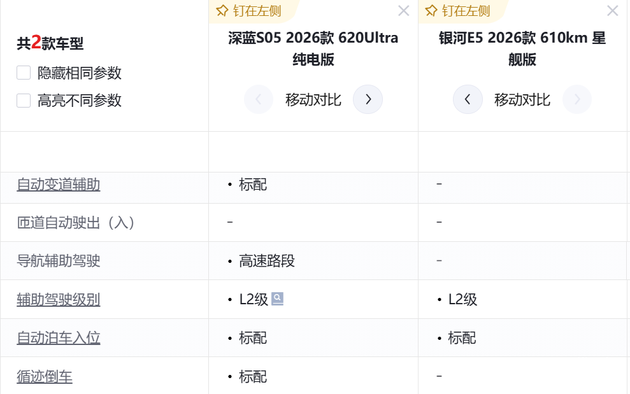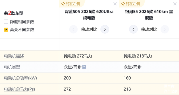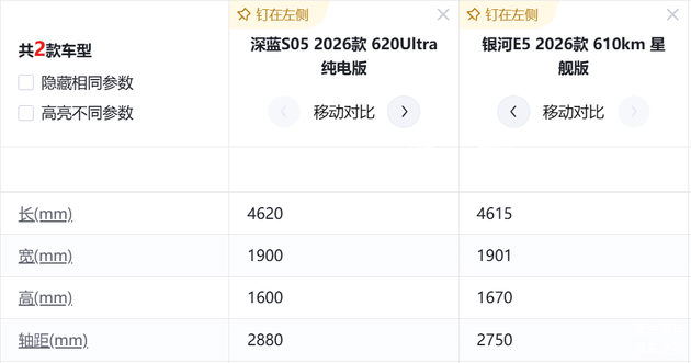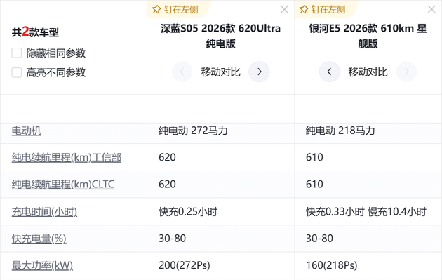 咱们分别选取两款车型的顶配,深蓝S05 620Ultra纯电版(以下简称深蓝S05)和银河E5 610km星舰版(以下简称银河E5),通过续航、空间、驾控、配置全方位的对比,给正在纠结这两款车的朋友们一个参考。