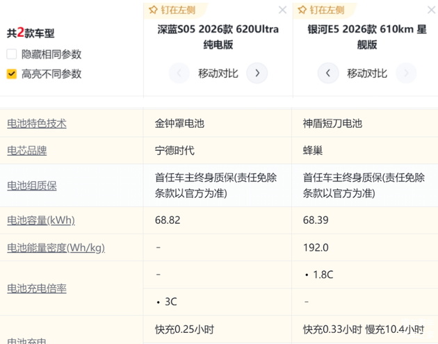 从对比表格中的数据可以一目了然,深蓝S05拥有620公里的工信部纯电续航里程,而银河E5的工信部纯电续航里程为610公里,相比之下,深蓝S05多出了10公里,说起来10公里的续航,对于动辄600多公里的整体续航来说,显得不太够看。但相差的这10公里续航,背后的技术差距却是比较明显。甚至可以说有着太大的实力悬殊。