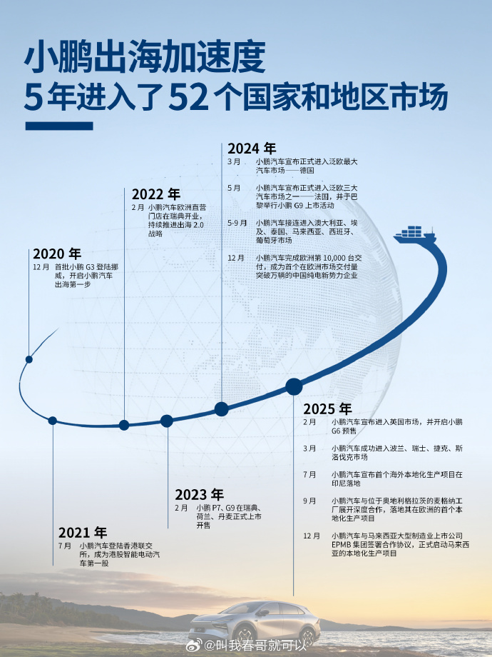 鹏子又开始往外飞了昂,官宣开启马来西亚本地化生产,除了印尼和奥地,这是它的第三个海外工厂,海外制造体系正在成形,您以为小鹏是中国新势力品牌,其实5年进入了52个国家和地区市场。