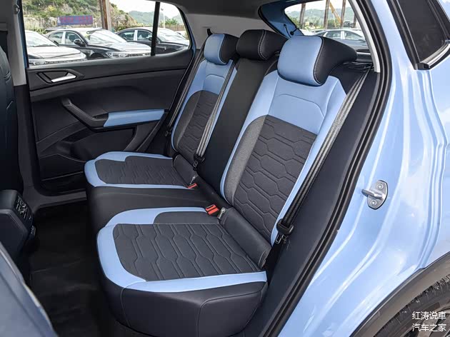 大众途岳新锐的空间谈不上宽敞,但满足一般家用足够,前排是一体式运动风格座椅,对身体的包裹感比较强,身高1.76米的乘客坐在后排,腿部空间有1拳近4指的距离,头顶空间有1拳出头的余量,只是并排坐满3名乘客,横向空间就会有点拥挤,并且地板中间有凸起,坐垫略短,后排座椅放倒后平整度一般。