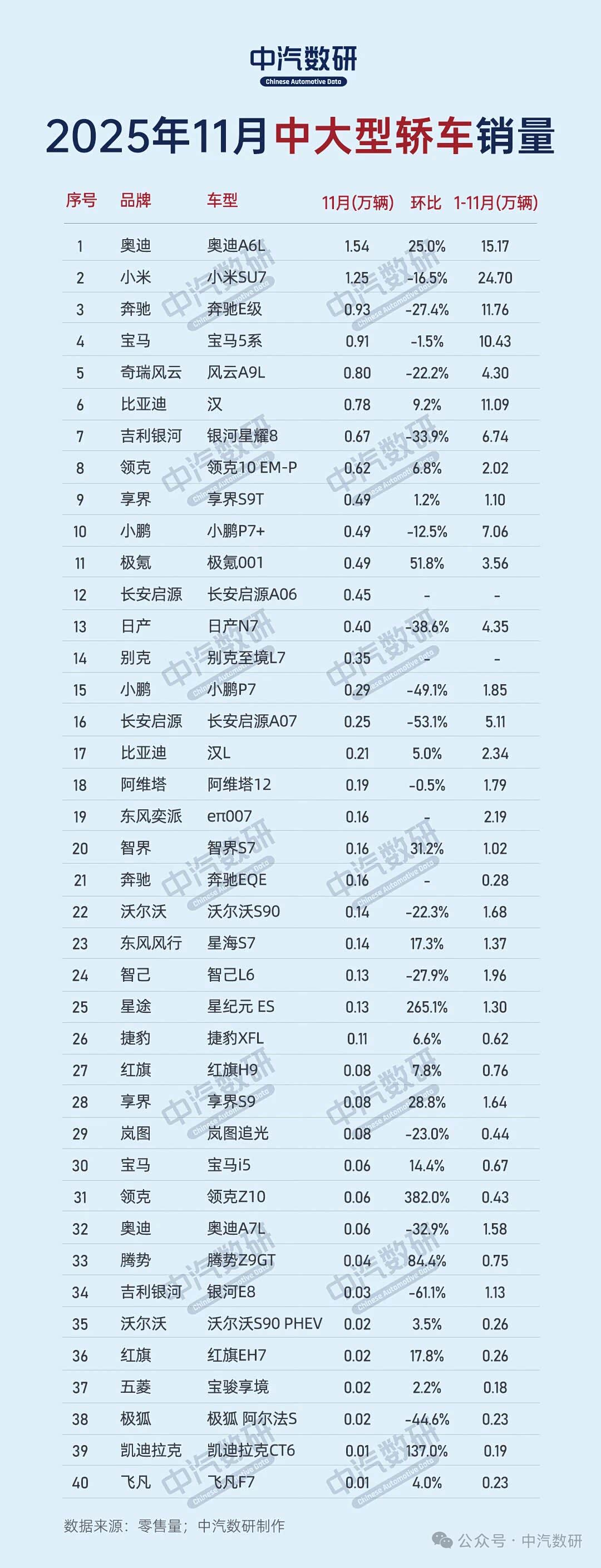 11月中大型轿车销量有多奇葩,同一车型纯电卖不过插混