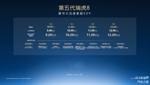 第五代瑞虎 8 诚意推出 8 重冠军礼遇,限时抢鲜价 9.29 万元起,让消费者购车更轻松、用车更省心!
