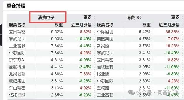 原因很简单,因为人家的重仓股不是传统消费,而是寒王、澜起,以及立讯精密等。(其他消费指数,在喝酒吃药电子电器汽车等更行业分布比较均衡)