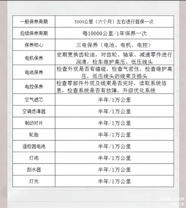 客服告诉他:电车当然也需要保养,但纯电车没有汽油发动机和变速箱这两大“精密机械”,少了最复杂、最贵的保养项目,主要是刹车、轮胎、底盘的检查,更换空调滤芯等。保养项目少了,频次也没那么多要求,保养支出就大幅下降了。