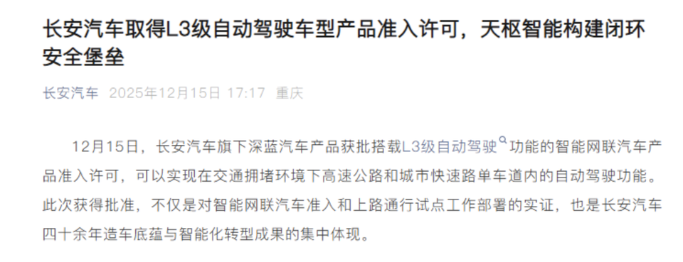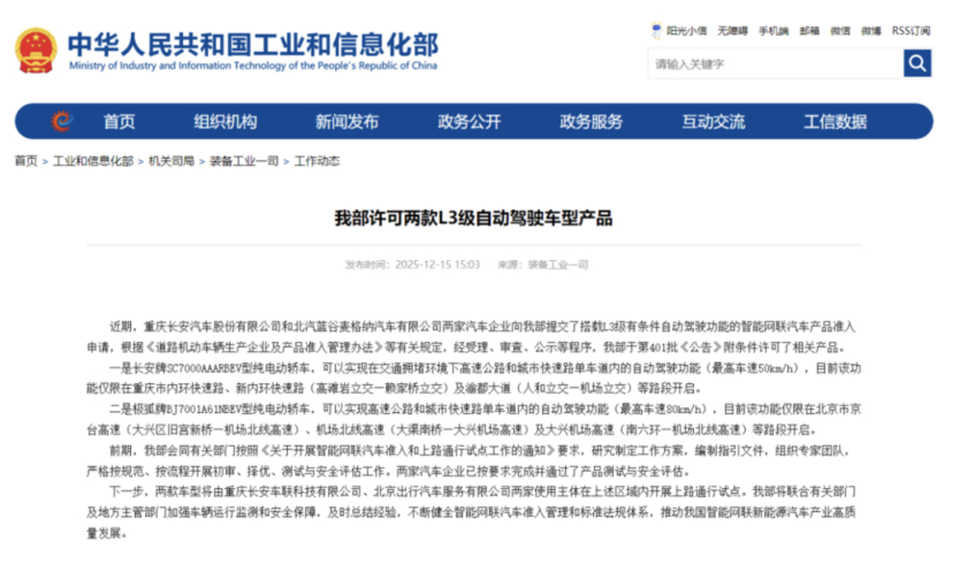 虽然对L3级驾驶辅助的定义和意义业界都存在争议,但L3级还是突然来了。工信部在官网发布消息称,许可两款L3级自动驾驶车型产品,一款为长安牌SC7000AAARBEV型纯电动轿车;一款为极狐牌BJ7001A61NBEV型纯电动轿车。