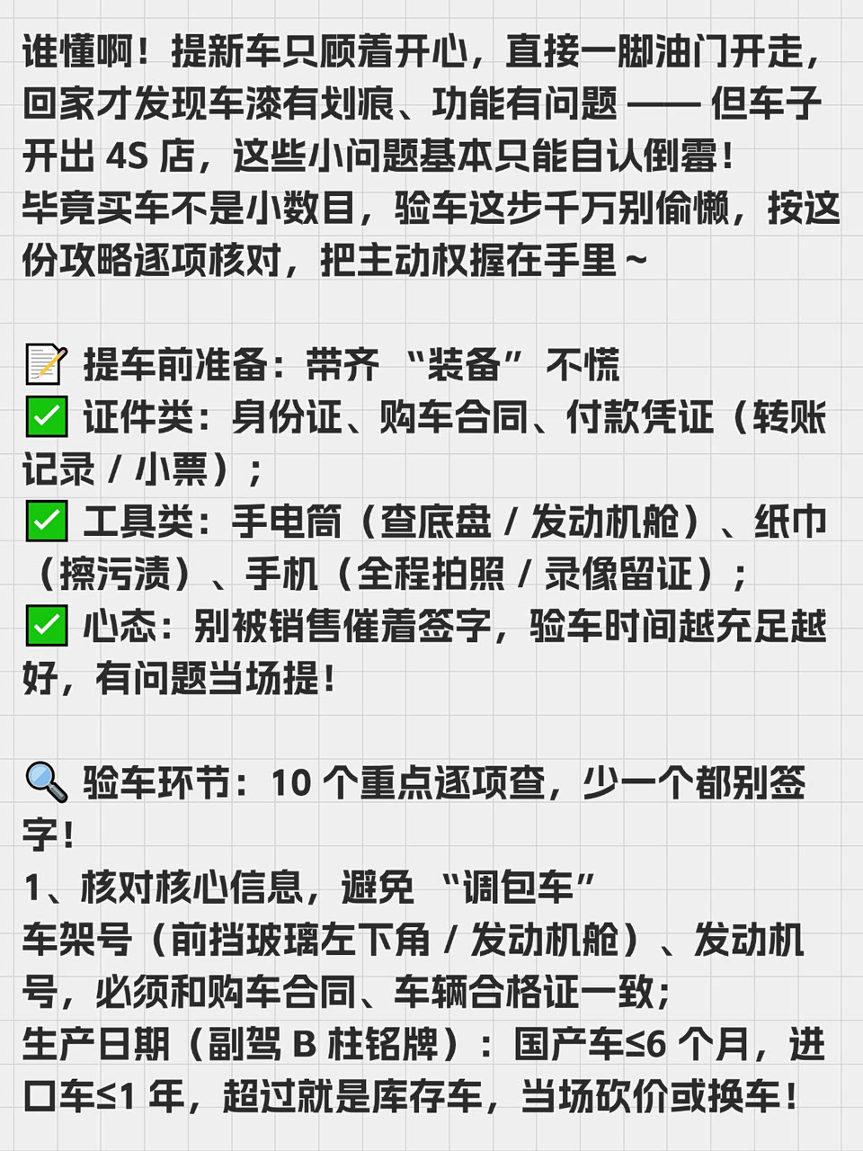 谁懂啊!提新车只顾着开心,直接一脚油门开走,回家才发现车漆有划痕、功能有问题 —— 但车子开出 4S 店,这些小问题基本只能自认倒霉! 毕竟买车不是小数目,验车这步千万别偷懒,按这份攻略逐项核对,把主动权握在手里~