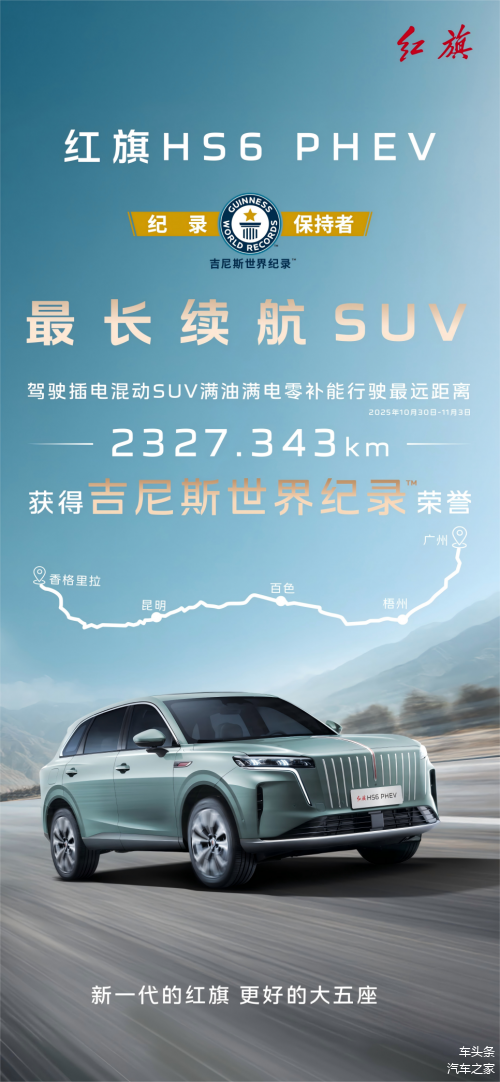 在能效表现上,红旗HS6的日常馈电油耗最低可达5.1L/100km,且仅需使用92号汽油,用车成本得到有效控制。而长达1650km的综合续航里程,则根除了长途旅行时的里程焦虑,实现了“城市用电省、长途用油畅”的全能体验。这一续航实力更有吉尼斯世界纪录背书——红旗HS6在吉尼斯官方见证下,以满油满电状态行驶2327.343公里,成功创造“驾驶插电混动SUV,满油、满电、零补能,行驶最远距离”的世界纪录。该事件一度登上微博热搜榜单,以硬核实测印证了其卓越的续航可靠性。