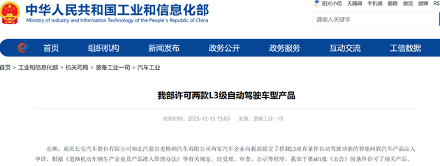 12月15日,盖世汽车获悉,国家工业和信息化部正式许可两款L3级自动驾驶车型产品。