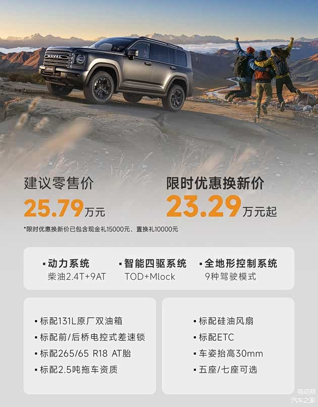 该车建议零售价为25.79万元,限时优惠换新价23.29万元起,限时优惠价已包含15000元现金礼与10000元置换礼,政策有效期为2025年12月11日至12月31日。相较于同配置的进口车型动辄超35万的价格,新车展现了明显的价格优势,让更多消费者能够触及长途穿越的梦想。