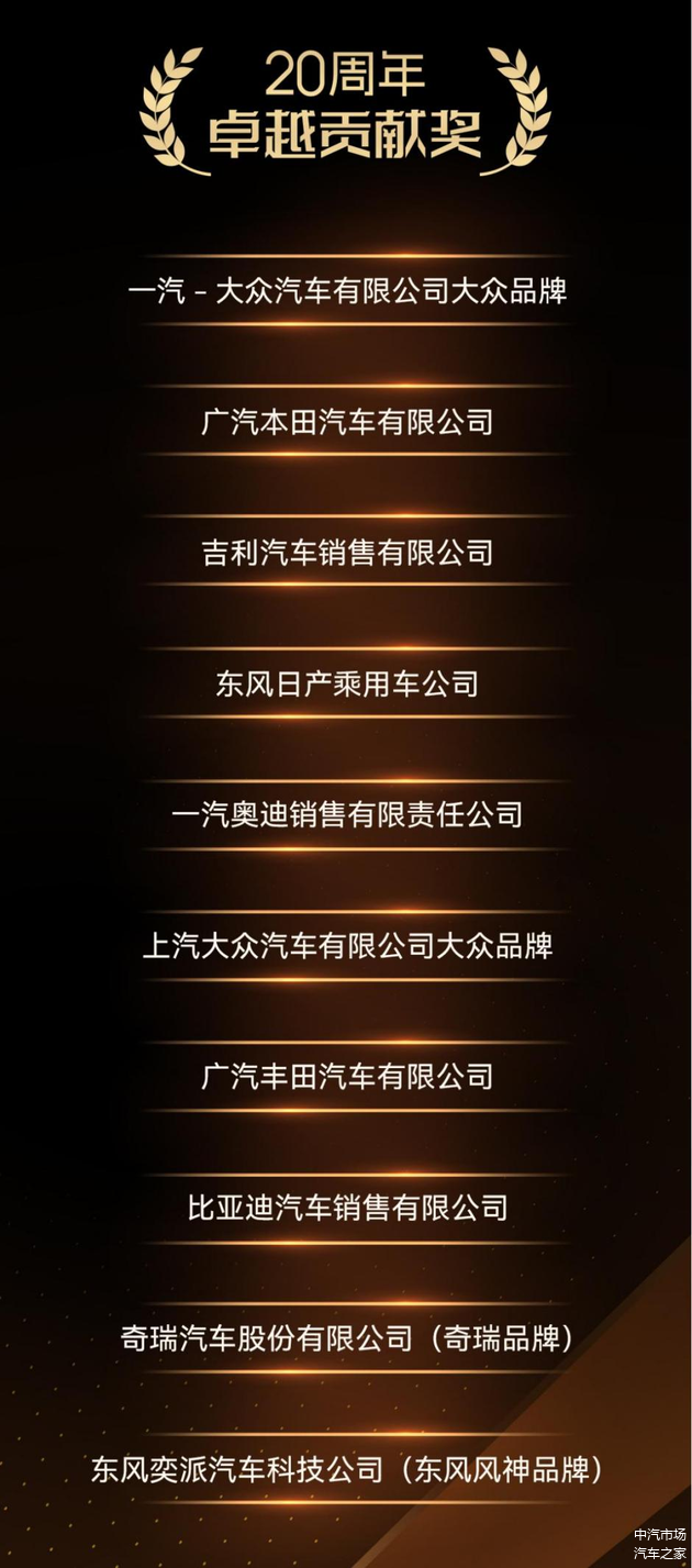 经过充分考虑并综合了各方专业人士的意见和建议,金扳手奖20周年“卓越贡献奖”最终共有一汽-大众汽车有限公司大众品牌、广汽本田汽车有限公司、吉利汽车销售有限公司、东风日产乘用车公司、一汽奥迪销售有限责任公司、上汽大众汽车有限公司大众品牌、广汽丰田汽车有限公司、比亚迪汽车销售有限公司、奇瑞汽车股份有限公司(奇瑞品牌)以及东风奕派汽车科技公司(东风风神品牌)10个国内优秀车企及品牌获奖。他们也是引领行业发展,深耕用户服务的标杆车企。