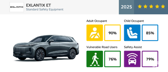 近日,全球权威汽车安全评测机构——欧洲新车安全评鉴协会(Euro NCAP)公布了最新一期的安全测试结果。作为EXEED星途品牌高端新能源系列的旗舰车型,EXLANTIX ET(国内名为ET)凭借卓越的综合安全性能,荣获最高五星安全评级。该车型在四大核心测试项目中成绩显著:成人乘员保护90%、儿童乘员保护85%、弱势道路使用者保护76%、安全辅助系统79%。这一殊荣不仅是对ET安全品质的权威背书,更展现出其在整车安全设计与技术研发领域的系统化实力。